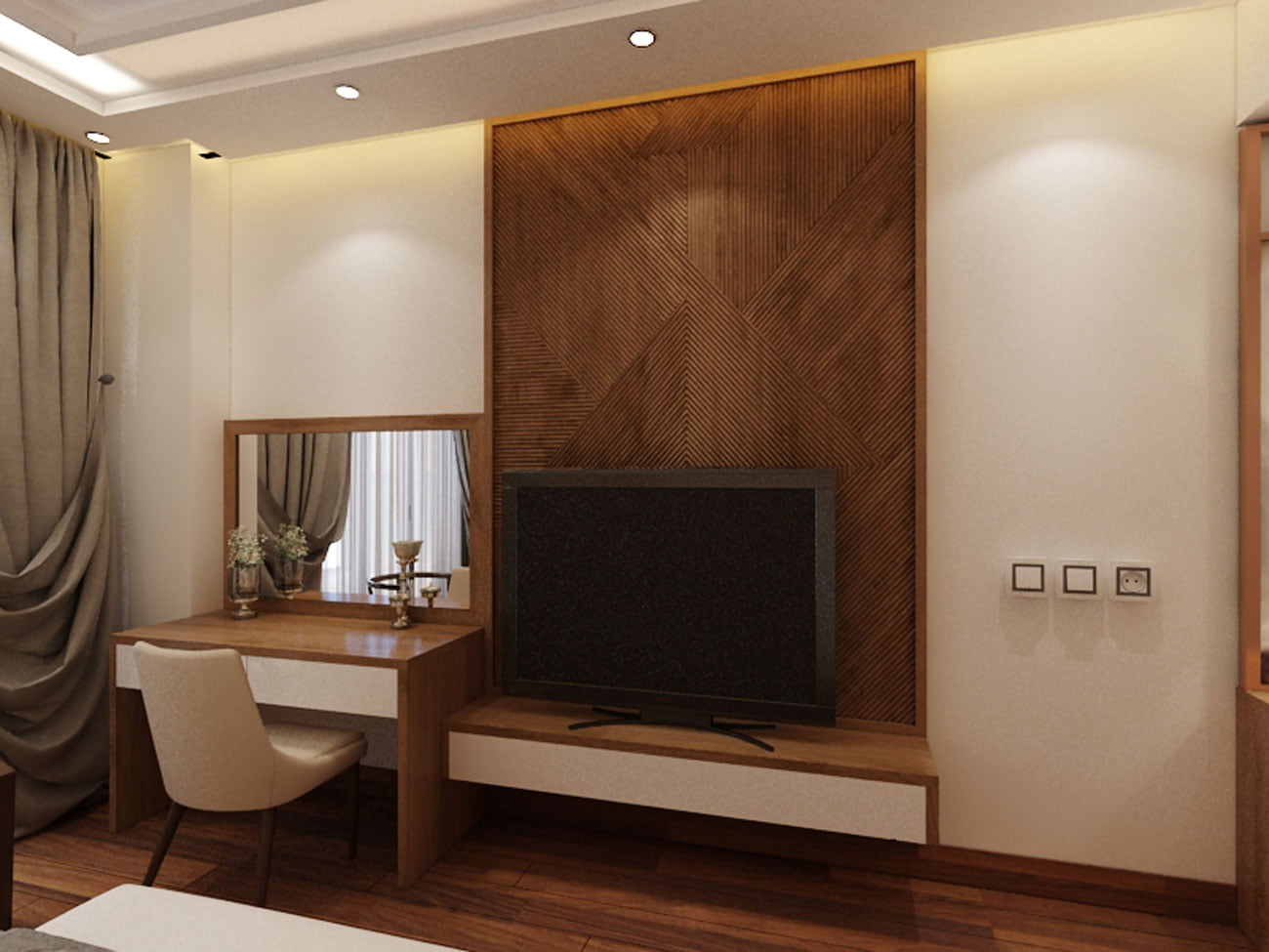 Các sản phẩm nội thất từ chất liệu gỗ công nghiệp cao cấp, được trang trí theo phong cách cổ điển và sang trọng. Phòng ngủ được thiết kế hài hòa với tổng thể, màu sắc nhẹ nhàng, ấm áp, mang lại cảm giác gần gũi và thân thiện. Vách ốp tường sau kệ tivi là điểm nhấn thu hút ánh nhìn, vừa tạo nét độc đáo vừa thể hiện sự sáng tạo cho không gian.