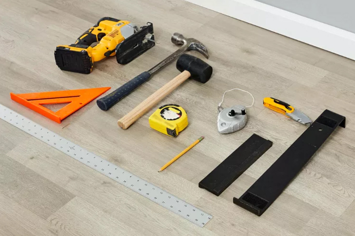 Cũng giống như khi thi công sàn nhựa, việc lát sàn gỗ yêu cầu chuẩn bị các dụng cụ cơ bản như: bút vẽ, thước la-de, thước dây, búa cao su, súng bắn keo, và các loại đinh dùng để đo đạc, đóng sàn và gắn phụ kiện như nẹp, len chân tường.